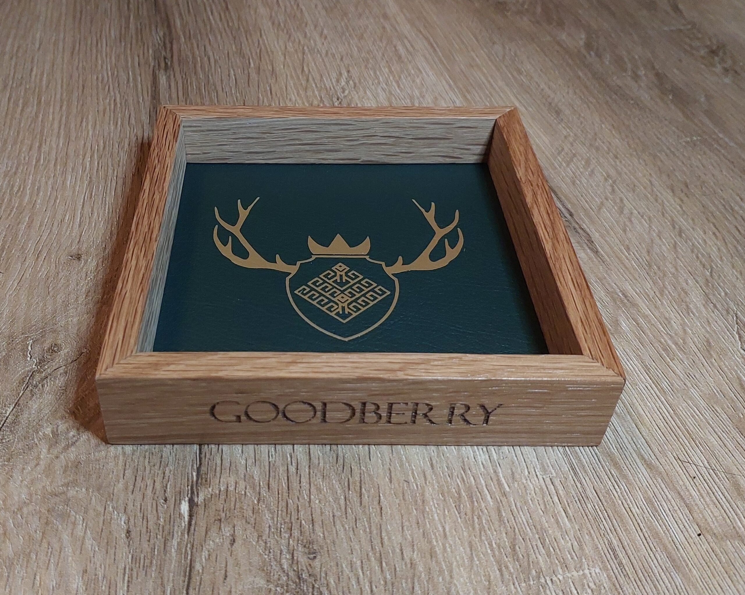 Crafted from warm oak wood, this compact dice tray combines classic craftsmanship with a rich, dark green faux leather vinyl inlay. The smooth, durable surface protects your dice and tabletop while adding a touch of color to your gaming setup.