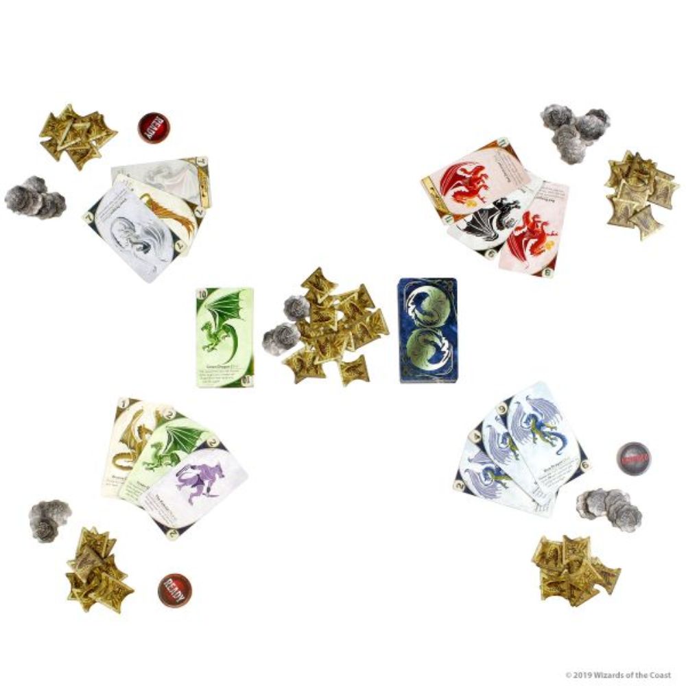 Three-Dragon Ante: Legendary Edition is a re-imagining of the original classic Dungeons & Dragons Three Dragon Ante, a casual standalone card game of chance for two to six players. Each hand, players ante gold to the stakes and compete to play the strongest flight of three cards, dragons, or mortals. The strongest flight wins that gold from the stakes, but playing weaker cards triggers your cards’ powers and sets you up to win the next hand. This Legendary Edition includes new Legendary Dragons, Mortals, Gold and Platinum Pieces, and Ability Disks for combining Three-Dragon Ante with the Dungeons & Dragons tabletop game!
